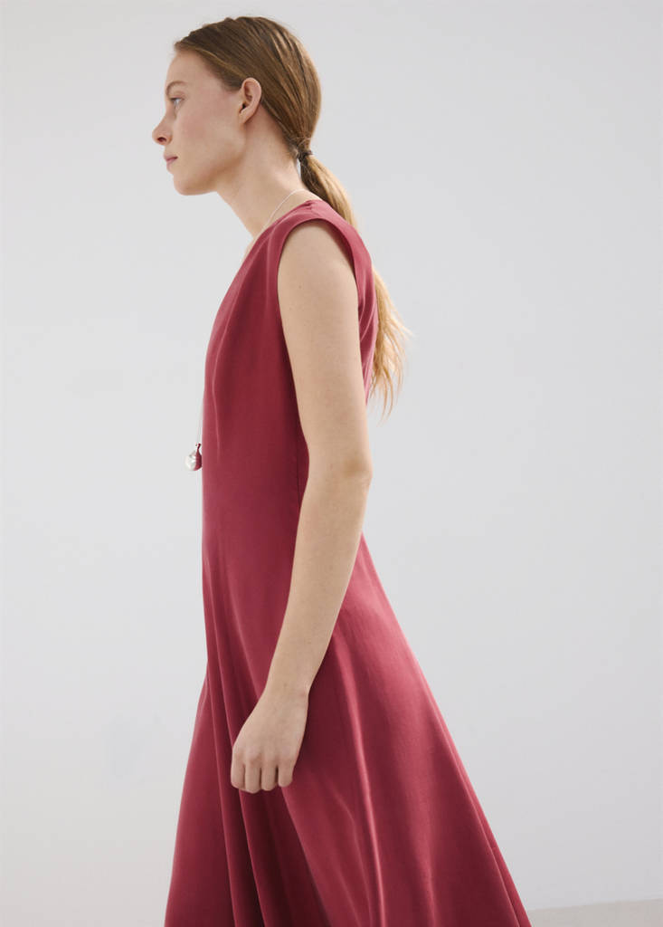Straight design. Midi design. V-neck. Sleeveless. Wide straps. Side zip closure. Inner lining
