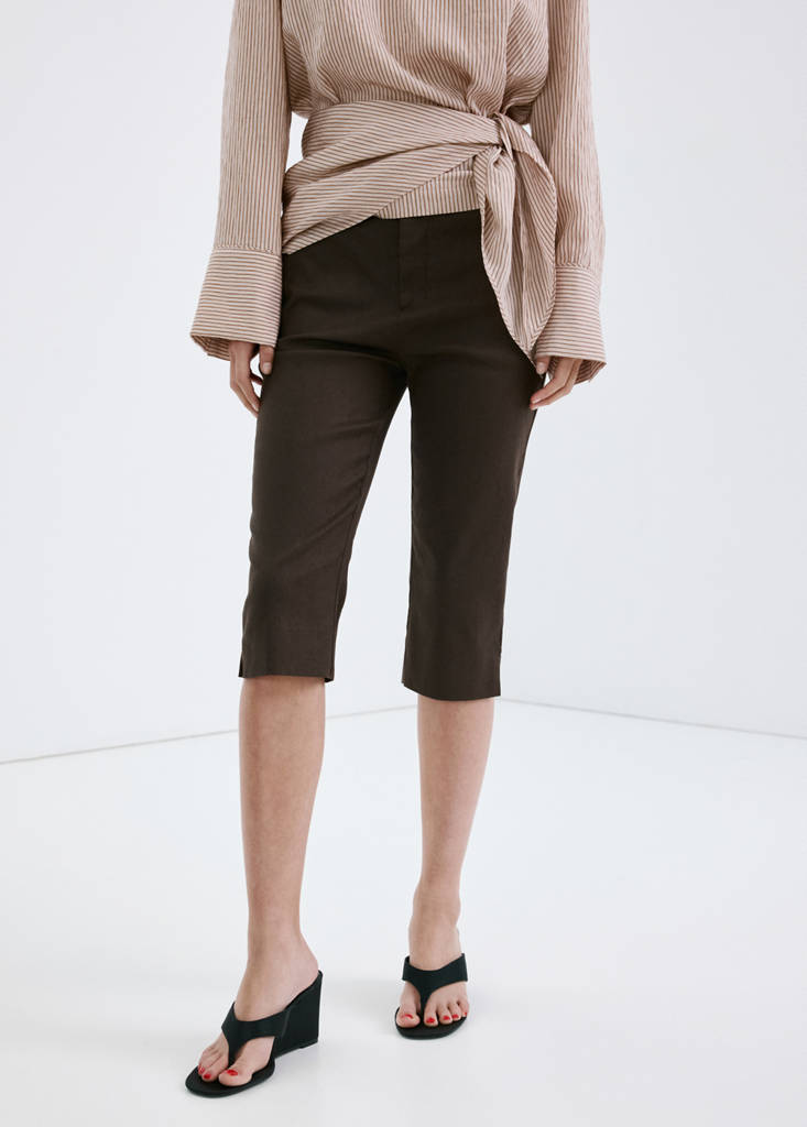 Linen and cotton blend fabric. Capri design. Mid-rise. Straight hem with side slits. Concealed button, hook and zip fastening. Inner lining. Total look