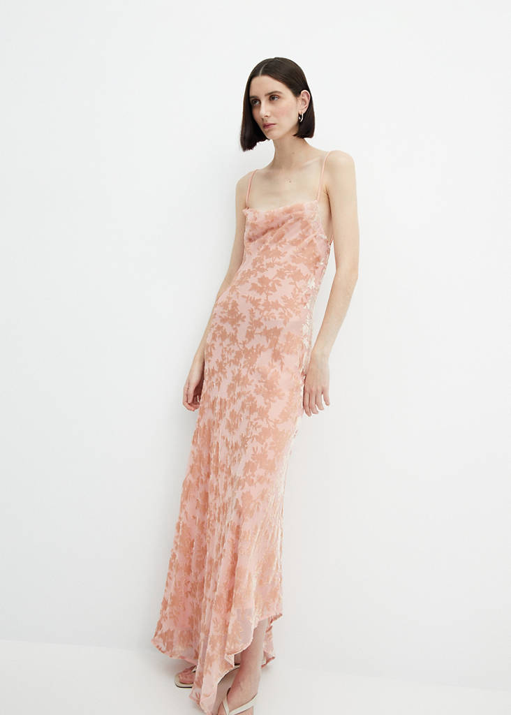 Fluid fabric. Asymmetric design. Straight design. Long design. Floral print. Draped neck. Thin straps. Back neckline. Asymmetric hem. No Fastening. Party, ceremony and communion collection. This garment belongs to our event collection, designed to make you the perfect guest at any party, wedding or ceremony
