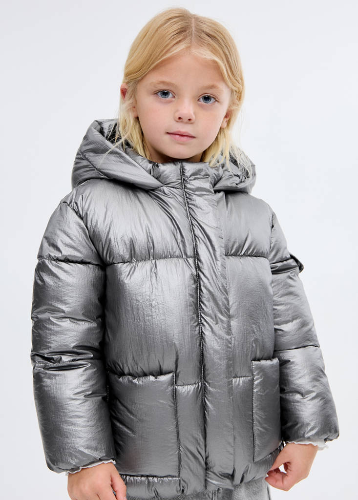 Quilted fabric. Metallic fabric. Short design. With hood. Long sleeves. Zip closure. Two front pockets. Christmas Collection