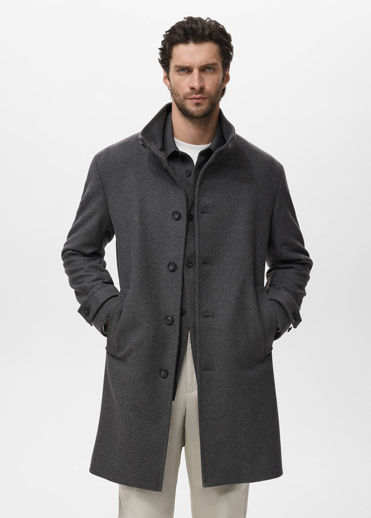 Wool mix fabric. Slim fit. Medium Length. Button-down collar with button closure. Button fastening at the front. Two front welt pockets. Long sleeves with buttoned strip cuffs. Inner lining