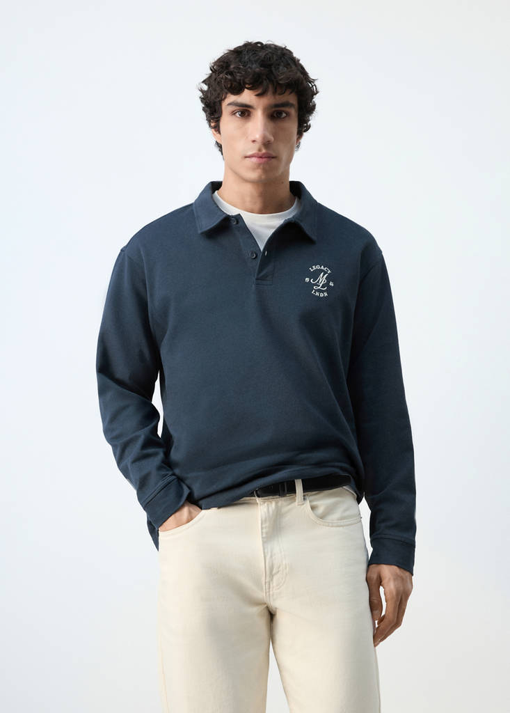 100% Cotton. Relaxed fit. Standard Length. Polo-neck with button closure. Embroidered graphic detail on the chest. Long sleeves. Hem with side slits