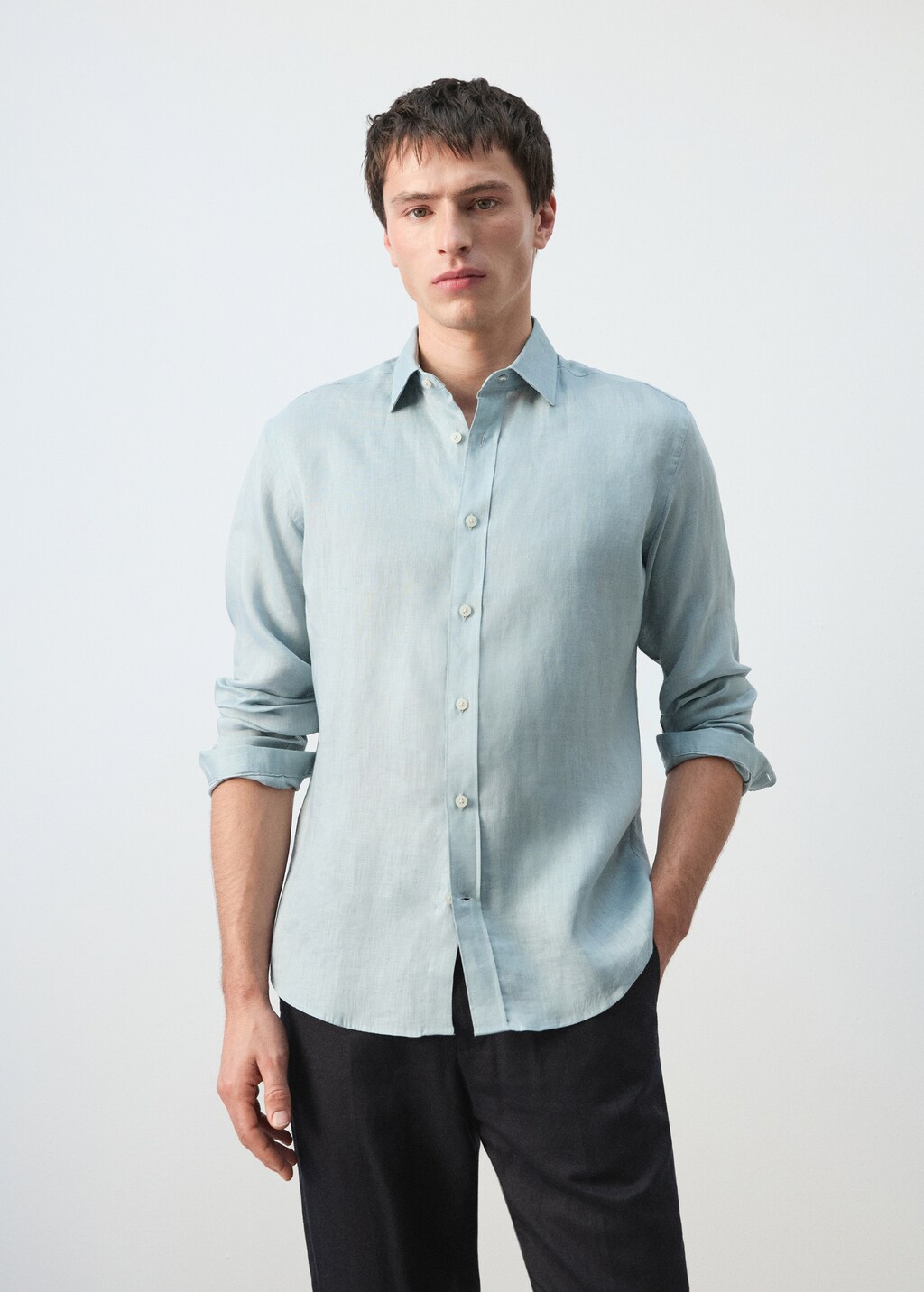 ESSENTIALS: Made to last. The sand and midnight blue colours are online exclusives. Regular fit. 100% linen fabric. Shirt collar. Long sleeves with buttoned cuffs. Detail of rear calipers. Front closure with buttons. Rounded base.