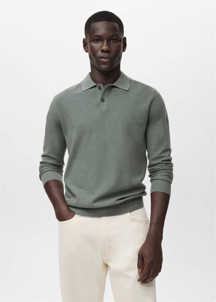 Straight silhouette. Cotton blend fabric. Fine-knit fabric with micro-structure. Polo collar. Long sleeves. Ribbed finish on neck, sleeves and hem