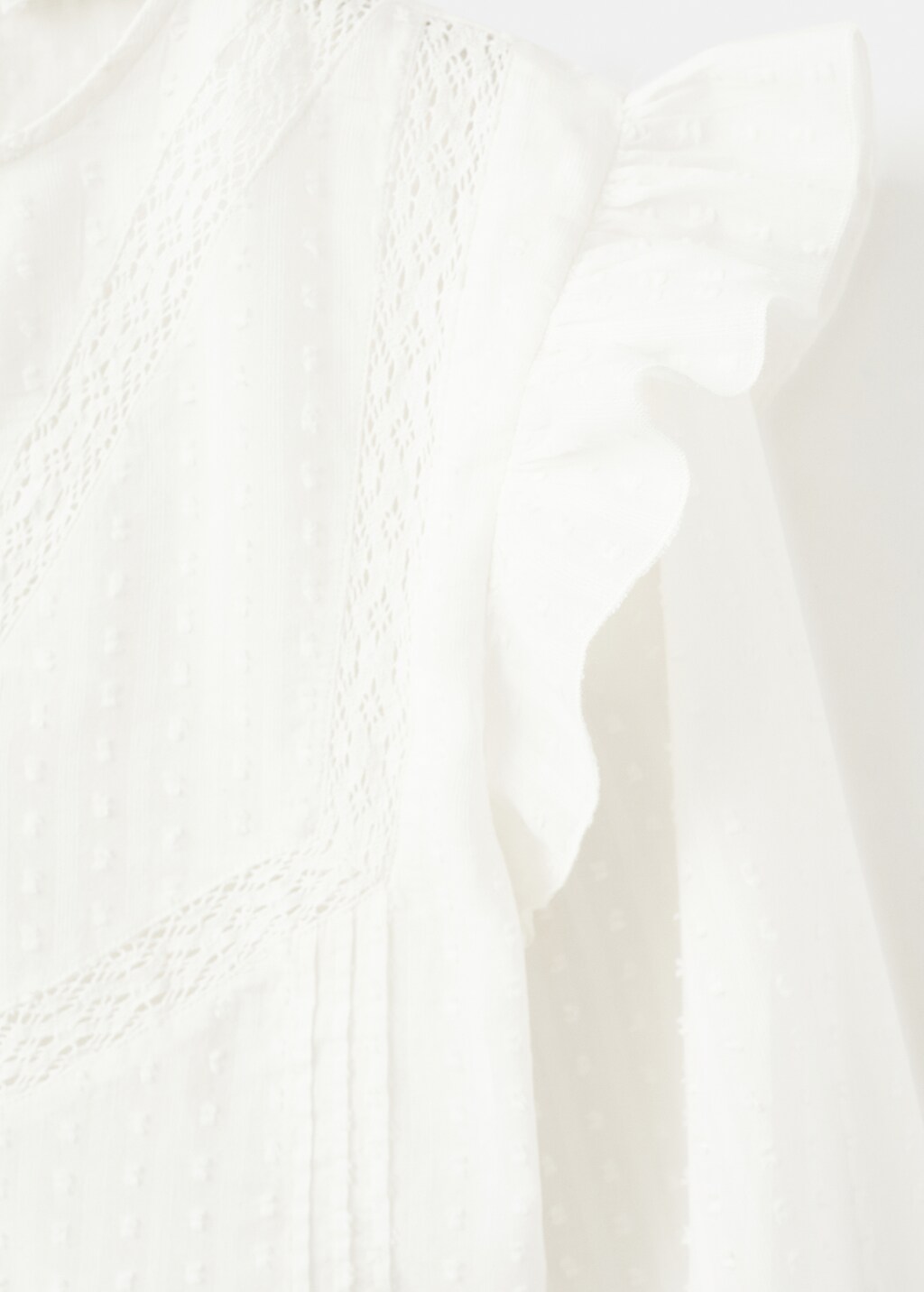 100% cotton fabric. Plumeti fabric. Embroidered design. Rounded neck with button fastening. Ruffles on the sleeves. Long sleeves with elastic cuffs.