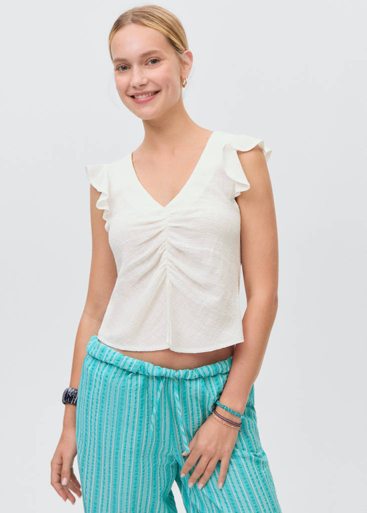 Ruffled-sleeve blouseCurrent price [Rs. 2,990.00 ]Rs. 2,990.00Select a colourOff WhiteSmall garment - Choose one size up from the usualSelect your sizeXXSNot available. I want it!XSNot available. I want it!SNot available. I want it!MNot available. I want it!LNot available. I want it!XLNot available. I want it!Notify meAdd to WishlistSee lookFree delivery to store100% cotton fabric. Textured fabric. Short design. V-neck. Sleeve with frill detail. Gathered detail on the chest. Opening in the lower frontDetails, composition and careStore availability