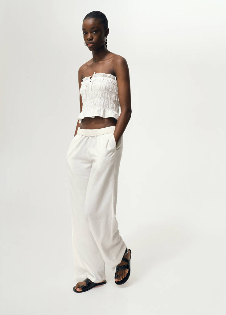 100% cotton fabric. Ruched panel. Short design. Straight design. Embroidered design. Flowered embroidery. Strapless. Bow detail on the neckline. Ruffle hem