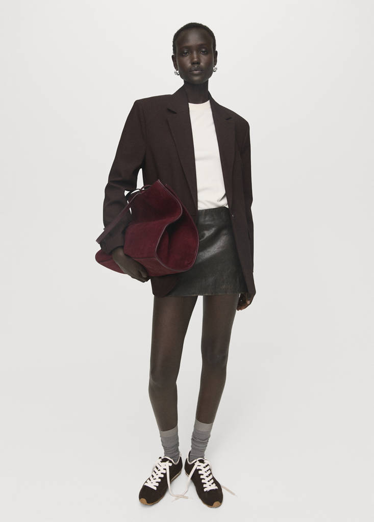 100% bovine leather. Suede. Shopper style. Two shoulder straps. Interior pocket with zip closure. Magnetic button closure. 100% cotton lining