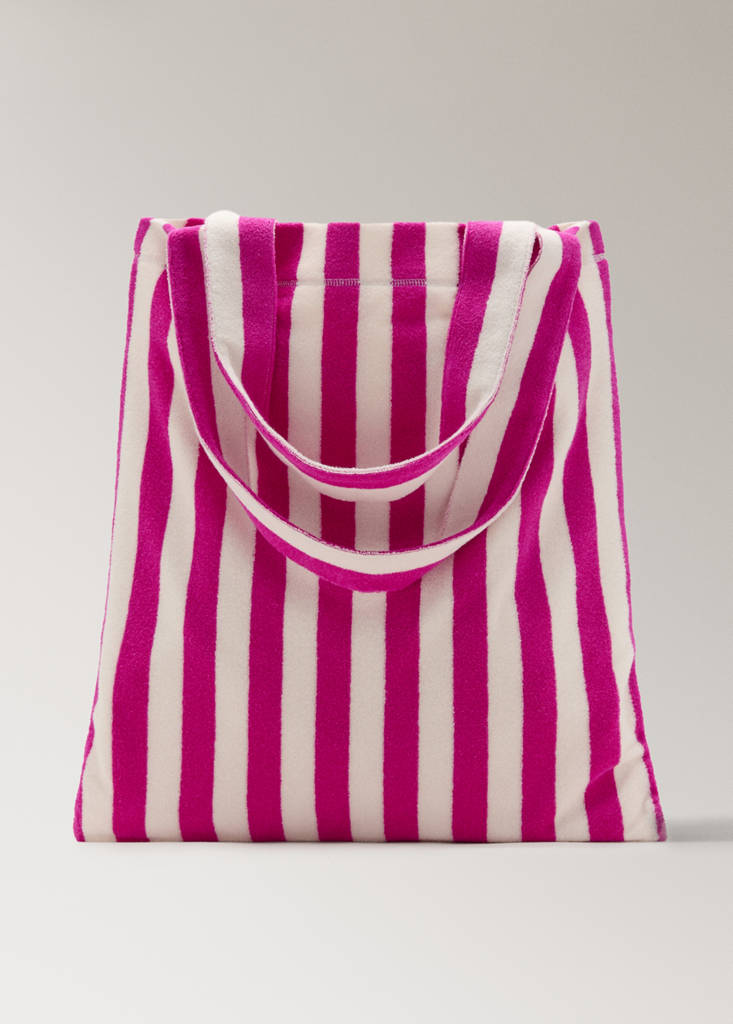 Striped terry cotton tote bagCurrent price [Rs. 3,290.00 ]Rs. 3,290.00Select a colourFuchsiaSelect your sizeOne sizeAddAdd to your wishlistSee lookFree delivery to storeCotton fabric. Tote design. Striped print. Two long shoulder handles. No Fastening66.0x50.0x45.0 cm (Length x Height x Width)Details, composition and careStore availability
