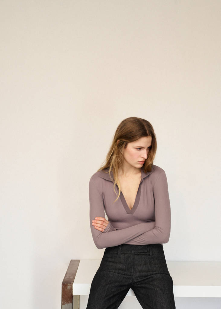 Body design. Fitted design. Shirt-style V-neck collar. Long sleeves. No Fastening