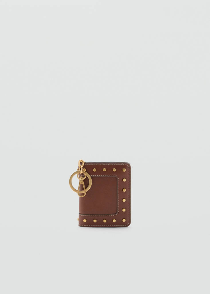 Small size. Faux leather. Decorative studs. Key ring detail. Multiple card slots. Flap closure with snap button. Inner lining