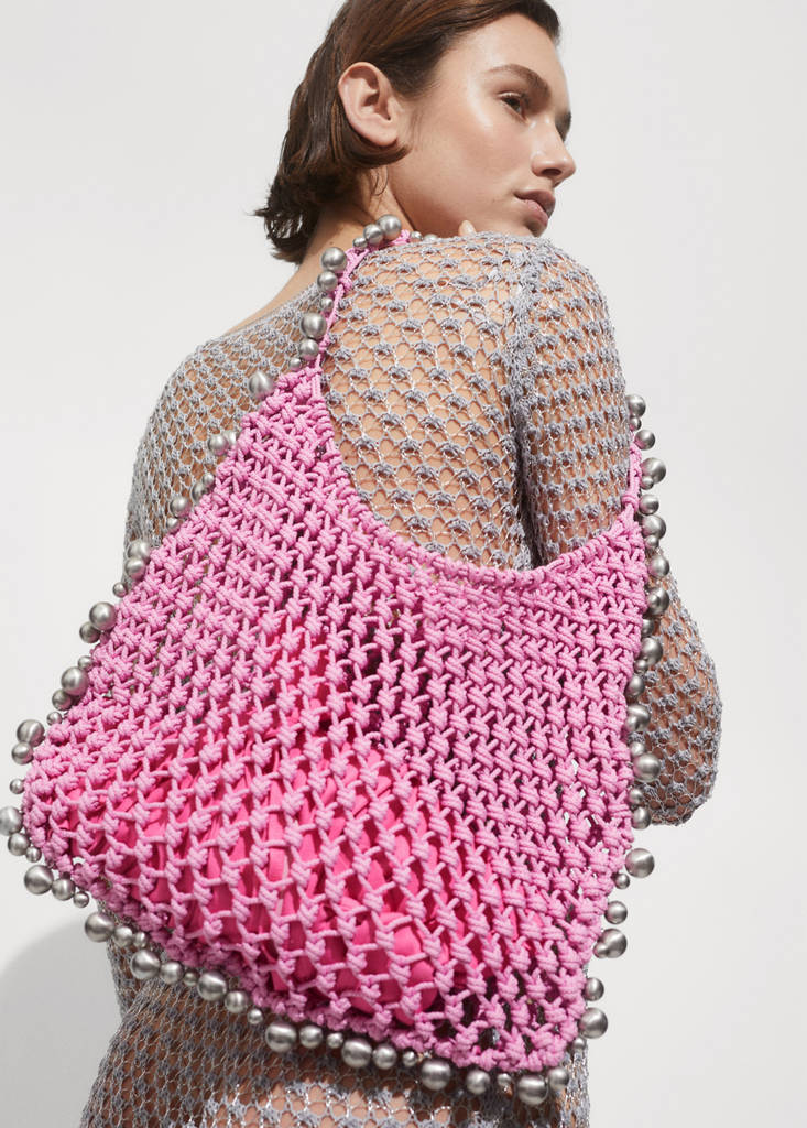 Large. Shopper style. Braided design. Shoulder strap. No Fastening. Irregular beads. Decorative beads. Beach accessories