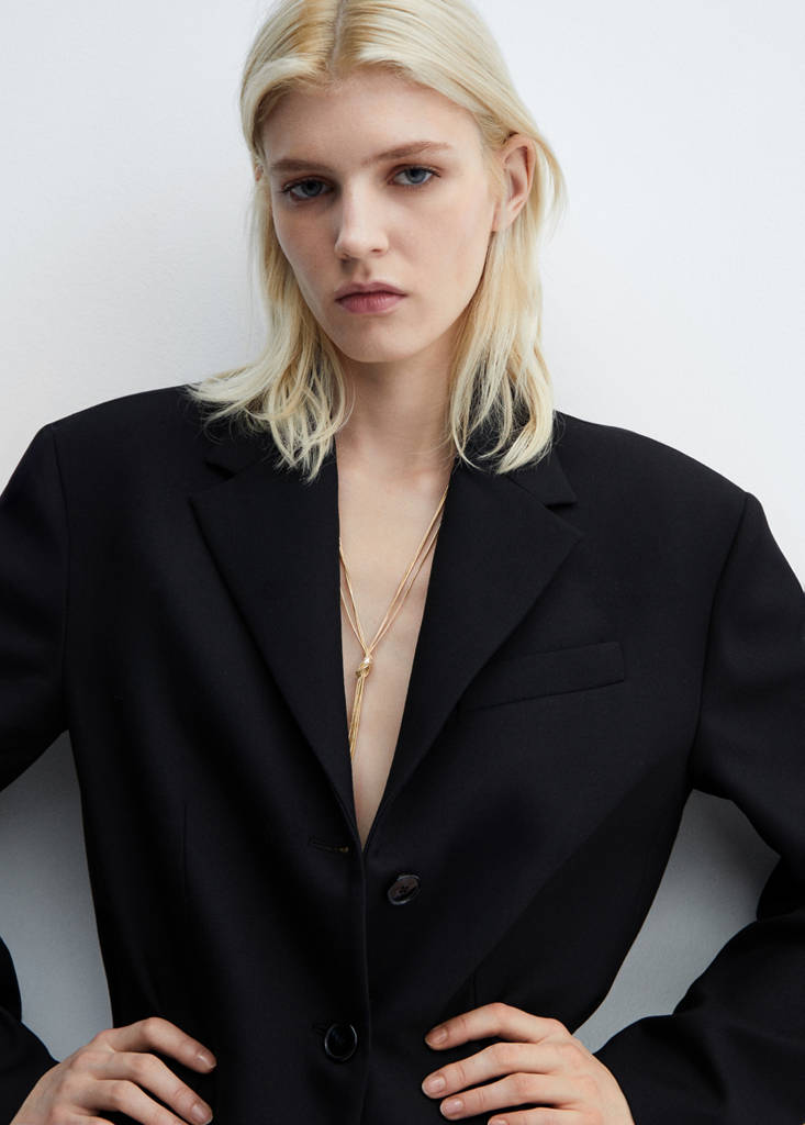 Long design. Metallic design. Fine chains. Knot detail. Zip and carabiner fastening.