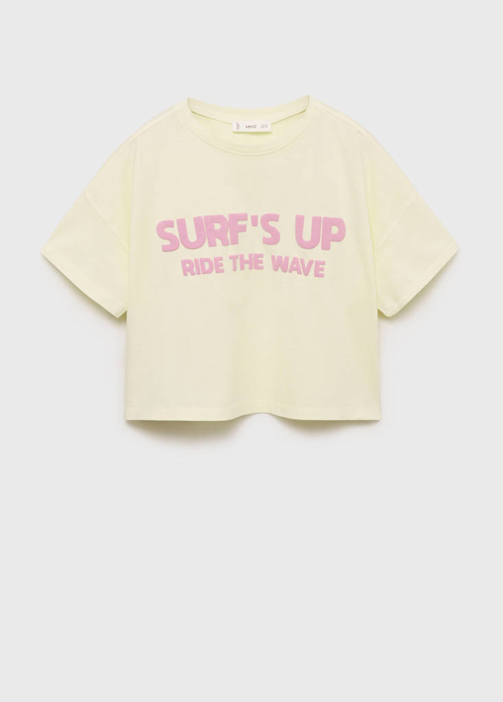 Embossed message t-shirtCurrent price [IRR 3,200,000.00 ]IRR 3,200,000.00Select a colourPastel YellowSelect your size5-6 years (116cm)7-8 years (128cm)9-10 years (140cm)11-12 years (152cm)13-14 years (164cm)DimensionsAdd to WishlistSee lookFree delivery to store100% Cotton. Straight design. Short design. Embossed message on the front. Round neck with ribbed finish. Short sleevesDetails, composition and careStore availabilityItem qualitiesRecycled cottonAt least 20%This fibre is obtained from pre- and post-consumer textile waste that is transformed into new fabrics.