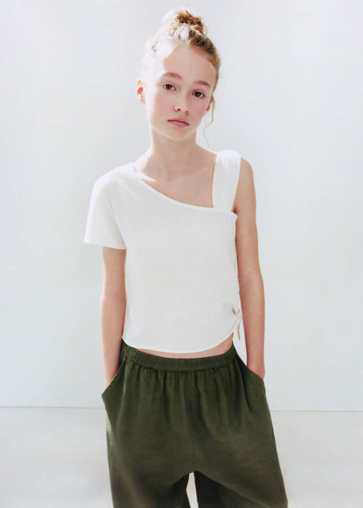 New NowOne-shoulder detail T-shirtCurrent price [IRR 3,900,000.00 ]IRR 3,900,000.00Select a colourOff WhiteSelect your size5-6 years (116cm)7-8 years (128cm)9-10 years (140cm)11-12 years (152cm)13-14 years (164cm)MeasurementsAdd to WishlistSee lookFree delivery to store100% cotton fabric. Textured fabric. Straight design. Asymmetric design. Cold shoulder detail. Short sleeves. Knot detail on the side of the T-shirtDetails, composition and careStore availabilityItem qualitiesRecycled cottonAt least 20%This fibre is obtained from pre- and post-consumer textile waste that is transformed into new fabrics.