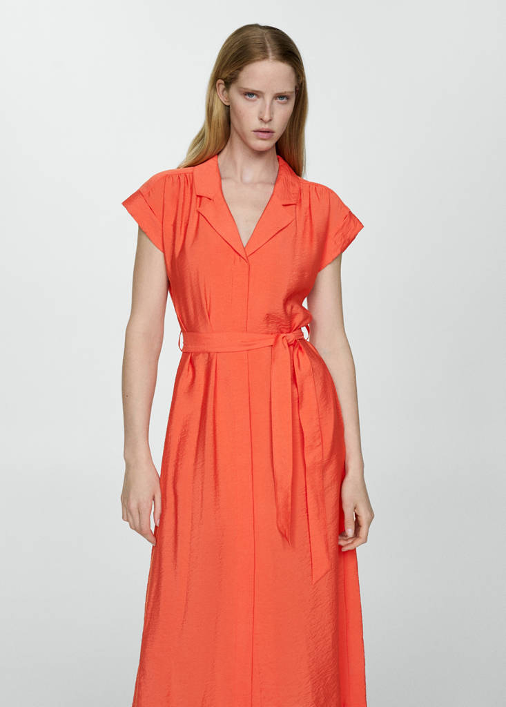 Fluid fabric. A-line design. Midi design. Shirt collar. V-neckline. Short sleeves with turn-up. Tie fastening. Ruched details. Available in plain and patterned. Concealed front button fastening