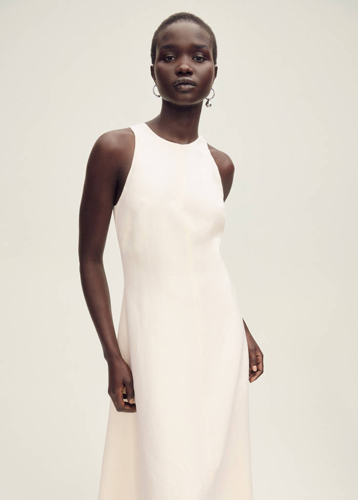 Linen mix. Midi design. A-line design. Halter neck. Sleeveless. Frayed hem. Zip fastening on the back section. Selection Collection