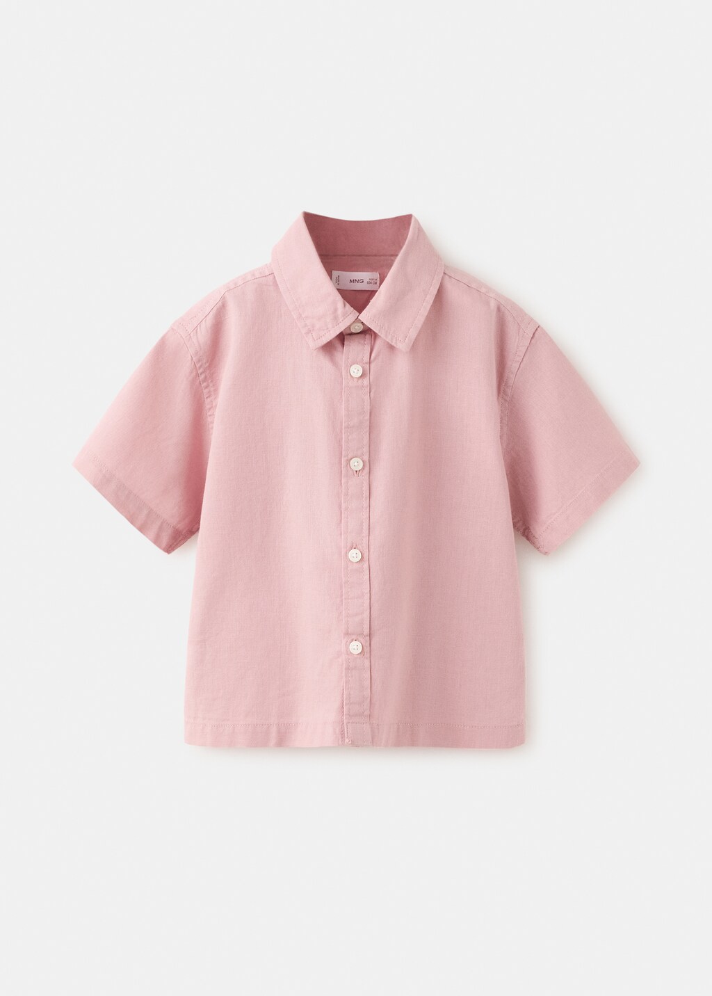 Crafted from a blend of cotton and linen, this garment features a straight design with a band collar and short sleeves. The front button closure completes its functional and versatile style.