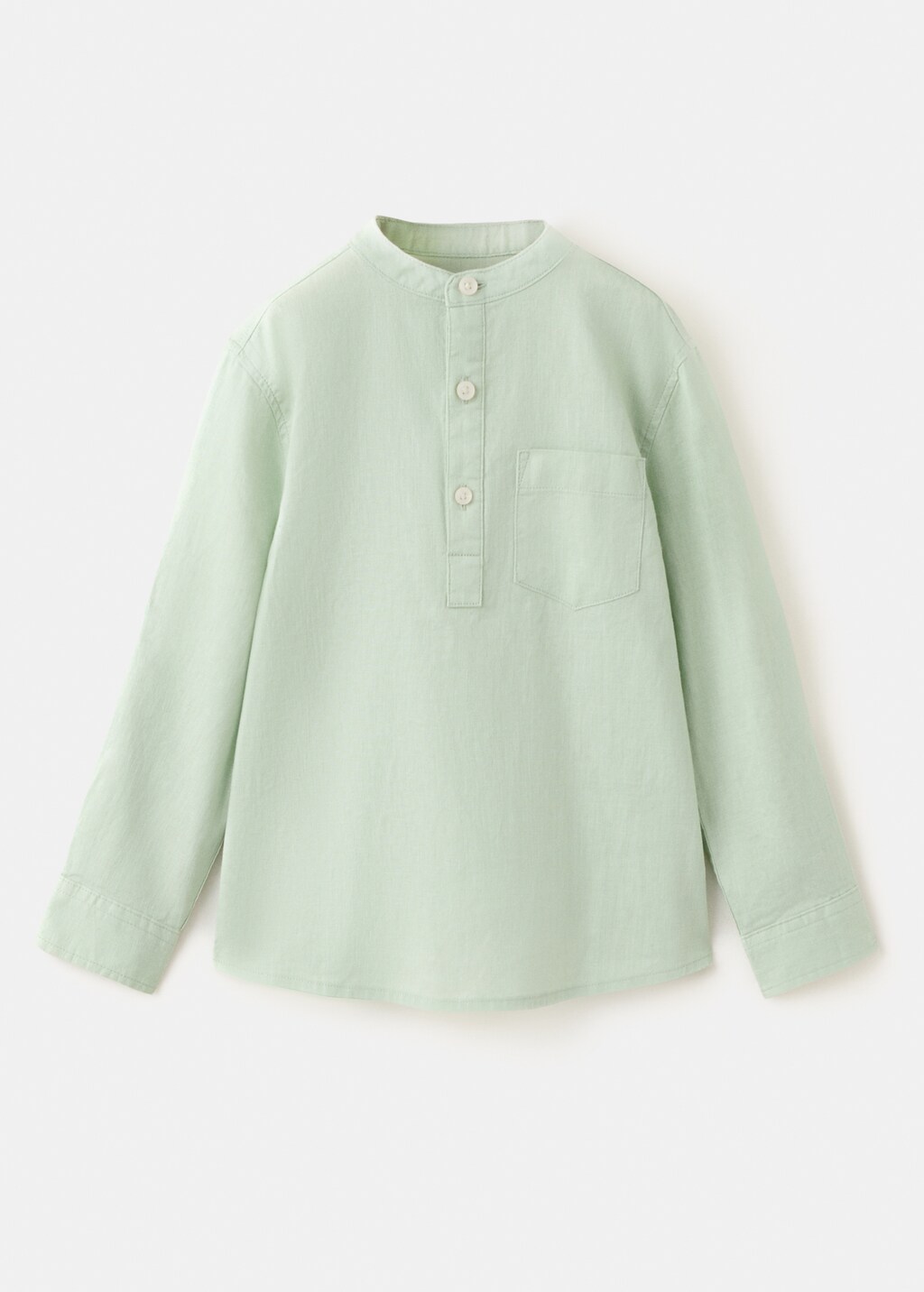 Crafted from a blend of linen and cotton, this garment features a straight design with a mandarin collar. It includes long sleeves with buttoned cuffs, a three-button front fastening, and a chest pocket.