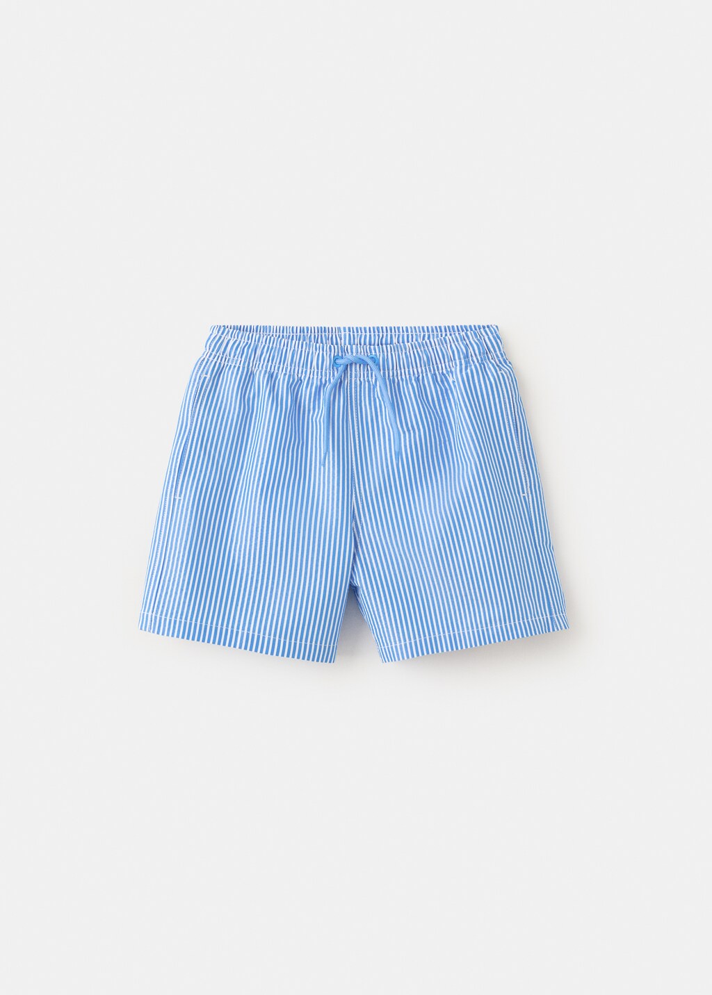 Boxer type. Seersucker fabric. Cotton blend fabric. Stripe design. Elastic waist with adjustable drawstring. Two side pockets.