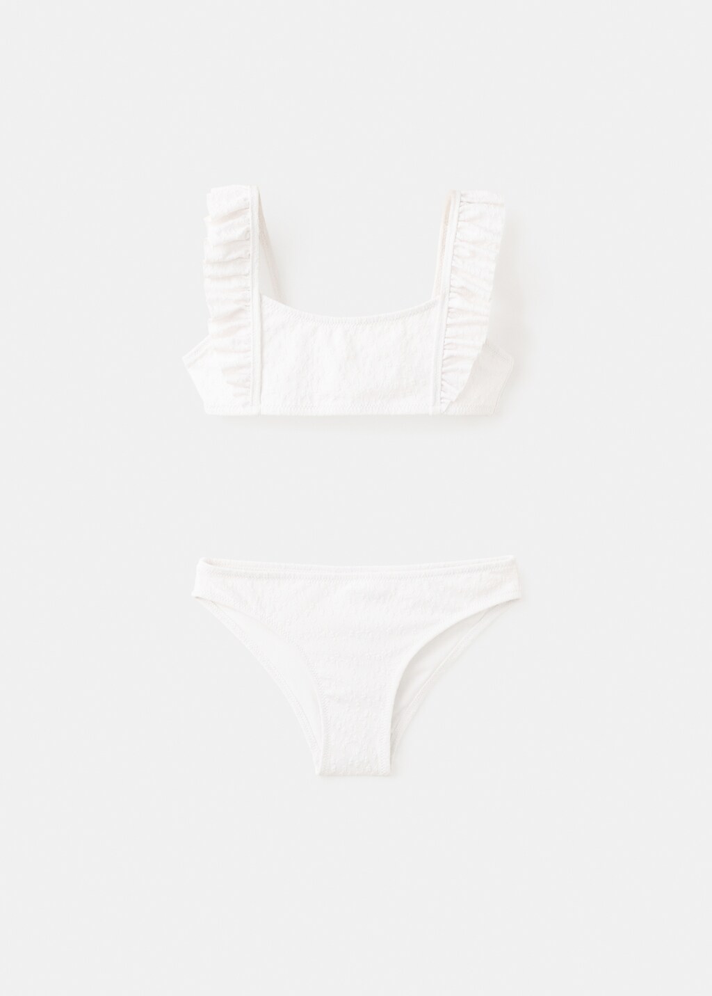 Bikini set. Stretch fabric. Embossed flowers. Ruffles on the straps.