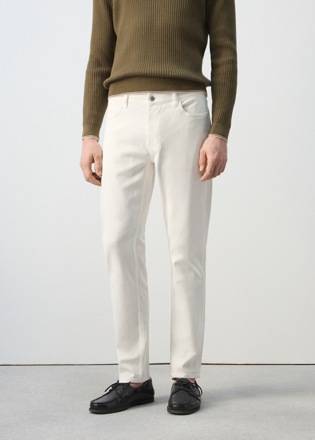 Slim fit. Soft touch fabric: a fabric treatment that provides a more pleasant feel for the customer. Cotton blend fabric. Two side pockets. Coin pocket. Two patch pockets at the back. Belt loops. Zip and button fastening.