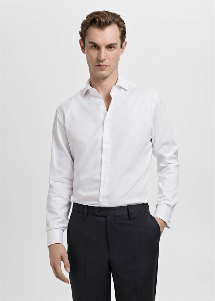 Regular fit. 100% cotton fabric. Cutaway collar. Long sleeves with buttoned cuffs. Front closure with buttons. Rounded base