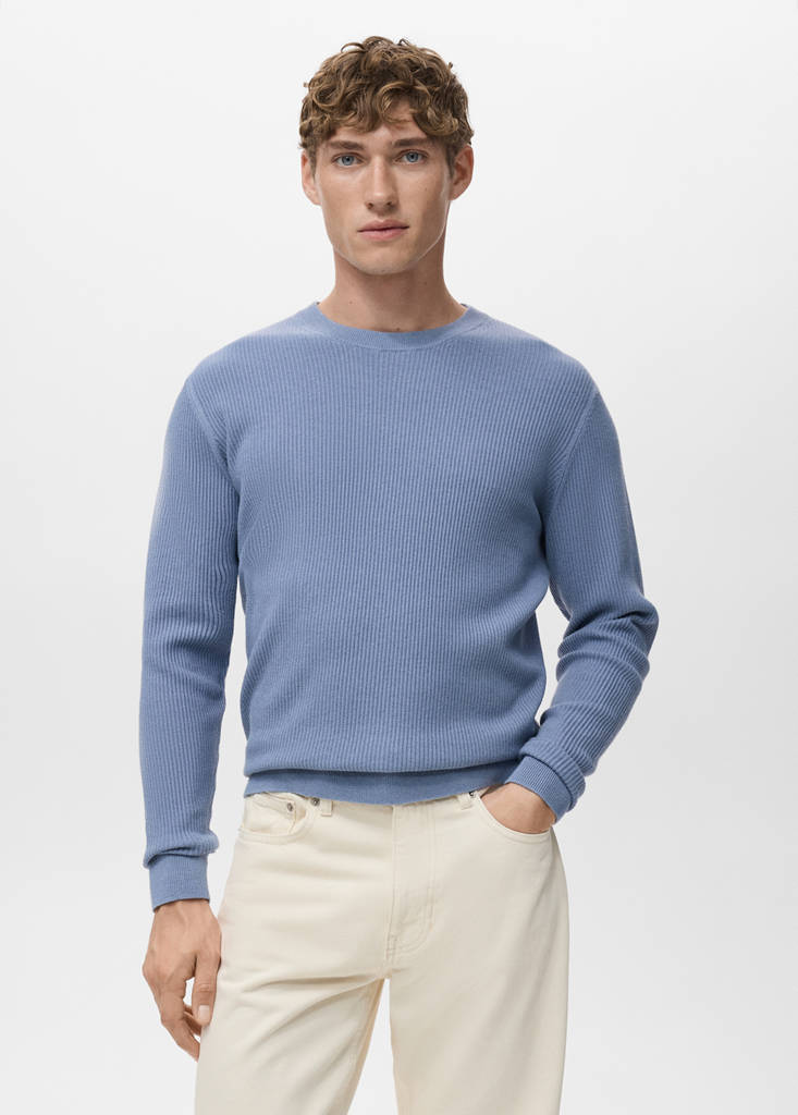 Regular fit. Cotton blend fabric. Cable knit fabric. Round neck. Long sleeves with elastic cuffs. Straight hem. Untrimmed hem. The chocolate brown and sky blue models are online exclusives. Fine knit fabric. Ribbed design. Standard Length. Long Sleeve Length. Straight Silhouette. Round Lapel Collar. Fine Knit Structure. Promotional product
