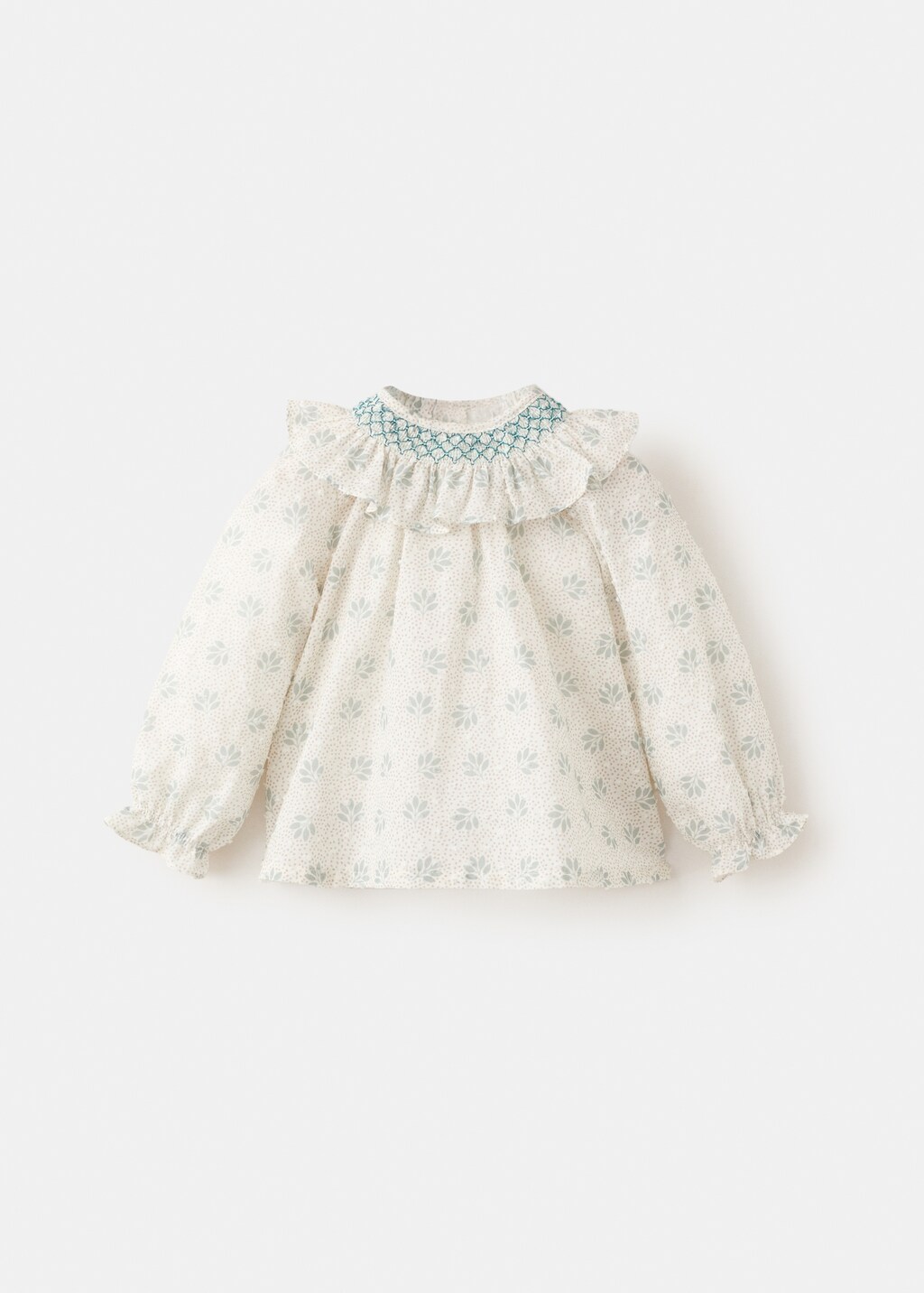 100% Cotton. Straight design. Printed design. Floral print. Babydoll collar. Long sleeves with elastic cuffs. Button up.