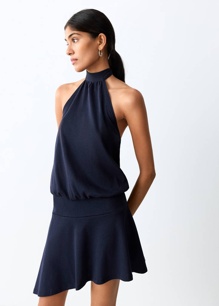 Asymmetrical halter dressCurrent price [€ 32.99 ]€ 32.99Select a colourDark NavySize change - Consult the Size GuideSelect your sizeXSNot available. I want it!SNot available. I want it!MNot available. I want it!LNot available. I want it!DimensionsNotify meAdd to WishlistSee lookConvenient home delivery100% cotton fabric. Short design. Asymmetric design. Halter neck. Sleeveless. Elastic waist. Back opening. Tie fastening. Asymmetric hem with rufflesDetails, composition and careStore availabilityItem qualitiesRecycled cottonAt least 20%This fibre is obtained from pre- and post-consumer textile waste that is transformed into new fabrics.