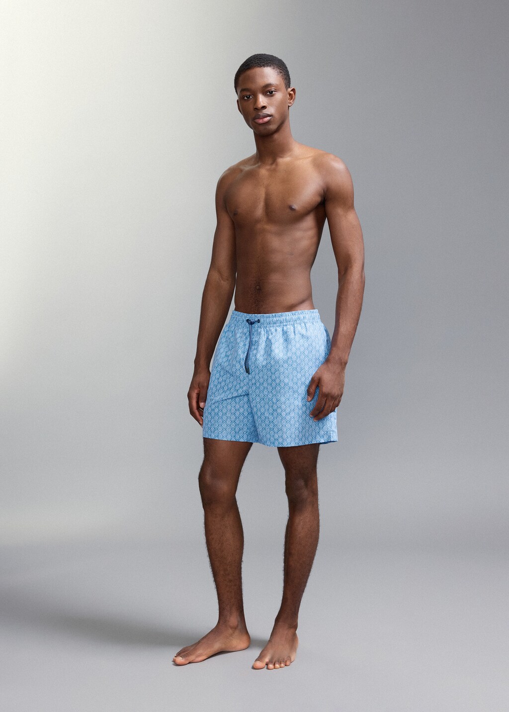 Straight design. Short design. Floral print. Elastic waist with drawstring. Back pocket.