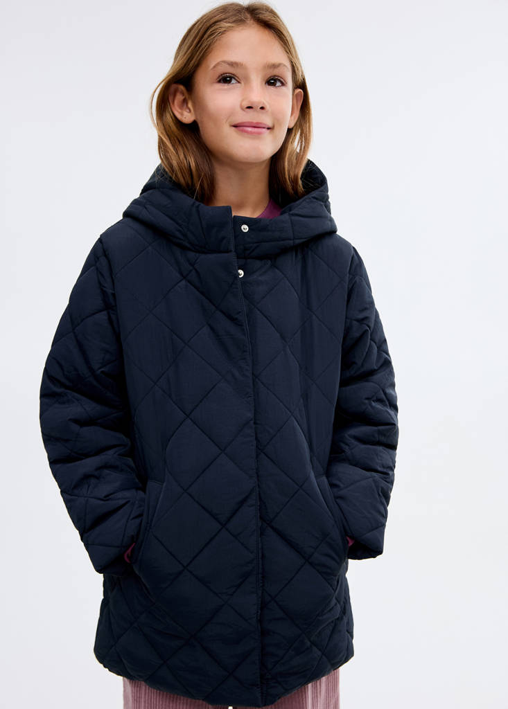 Tessuto trapuntato. Disegno con rombi. Design lungo. Con cappuccio. Manica lunga. Chiusura con bottoni a pressione. Due tasche laterali