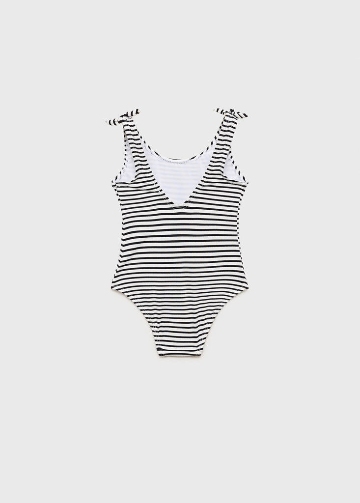Tessuto elasticizzato. Stampa a righe. Collo stondato. Spalline con fiocco decorativo. Schiena a V. Slip classico. Prodotto in promozione