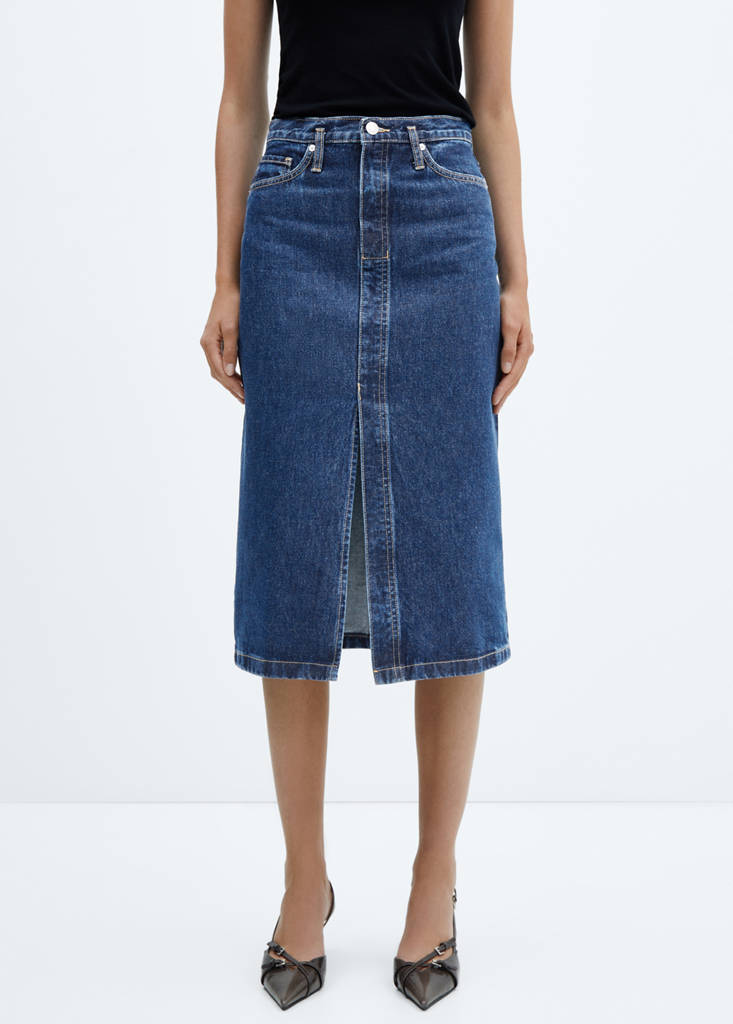 Tessuto di cotone stile denim cowboy. Design midi. Design diritto. Chiusura con zip e bottone. Passanti per cintura. Cinque tasche. Spacco sul bordo inferiore, lato anteriore. Disponibile Plus. College