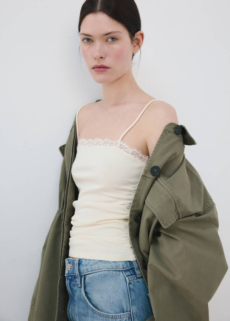 Design aderente. Dettaglio pizzo. Dettagli arricciati. Collo scollato. Senza maniche. Spallina sottile. Senza chiusura