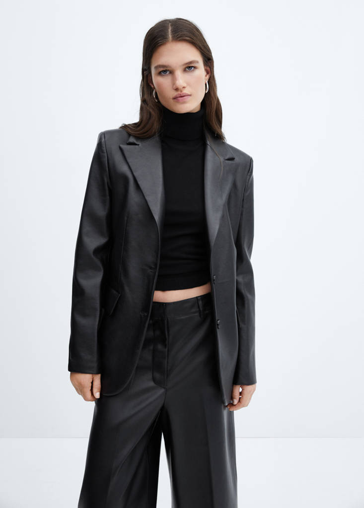تأثير الجلد. ياقة بطيات على شكل حرف V. طيات صدر مسننة. أكمام طويلة مع أساور بأزرار. إغلاق بزرين في الجزء الأمامي. جيبان بقلابات بزر في الأمام. وسادات أكتاف. طية خفيفة. بطانة داخلية. اللون البني حصري عبر الإنترنت. إطلالات المكتب. تصميم ضيق