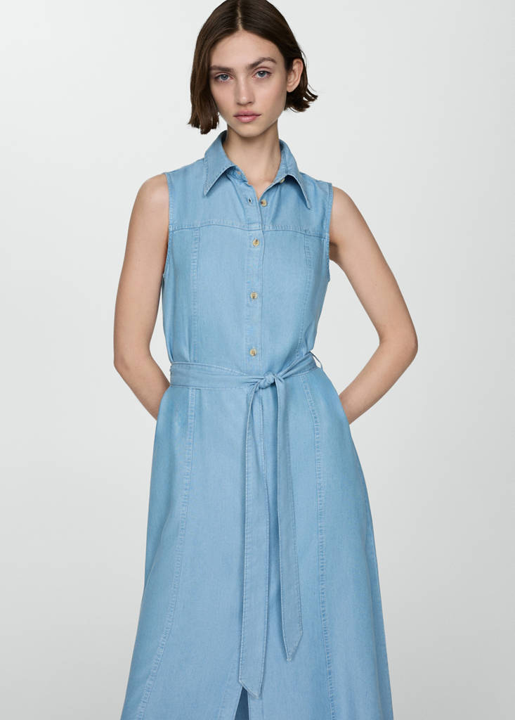نسيج ليوسيل. نسيج بامبولا. تصميم ميدي. تصميم إيفازي. ياقة قميص. بدون أكمام. حلقات حزام. رباط على الخصر قابل للتعديل. إغلاق أمامي بأزرار