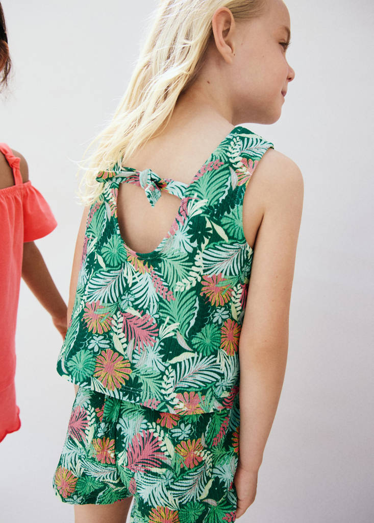بفضل تصميمها المستقيم والنقشة الاستوائية، تتميز هذه القطعة بياقة دائرية وبدون أكمام. وتضيف الفتحة في الظهر بإغلاق العقدة لمسة خاصة، بينما تكمل الحاشية بالكشكش الإطلالة