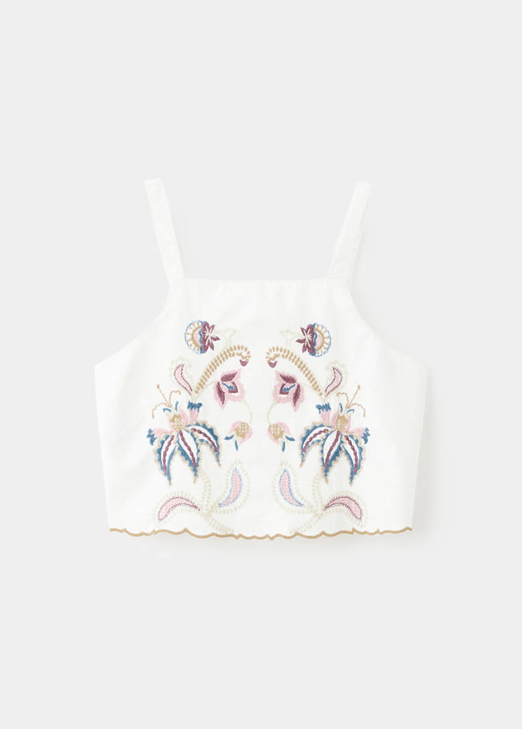 نسيج 100% قطن. تصميم مستقيم. ياقة مستقيمة. حمالات. إغلاق بأزرار في الخلف. تفاصيل مطرزة بتباين