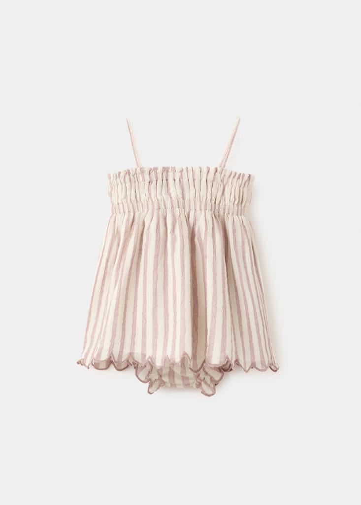 نسيج 100% قطن. تصميم مخطط. ياقة مستقيمة. حمالات. خصر مطاطي. رانيتا نهايات مرنة. تفاصيل كشكش في الحاشية. تفاصيل مطرزة بتباين