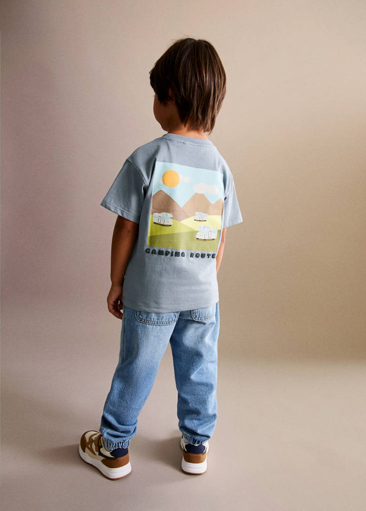 100% cotton fabric. Short design. Printed design. Round neck. Short sleeves. Image printed on the front. Printed drawing of a landscape with mountains on the back