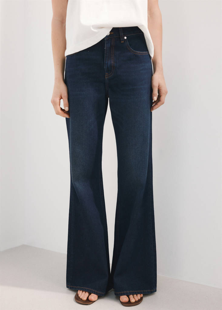 Denim-style cotton fabric. Long design. Flare design. Mid-rise. Belt loops. Five pockets. Front zipper and button closure