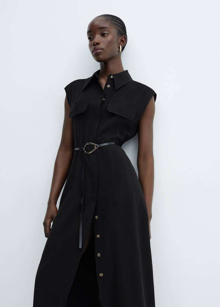 Front closure. Shirt collar. Long design. Lightweight fabric. Sleeveless. Without inner lining. A-line design. Fluid fabric. Midi design. Two chest pockets with flaps. Belt loops. Concealed button closure on the front. Removable belt. Decorative seams. Straight design
