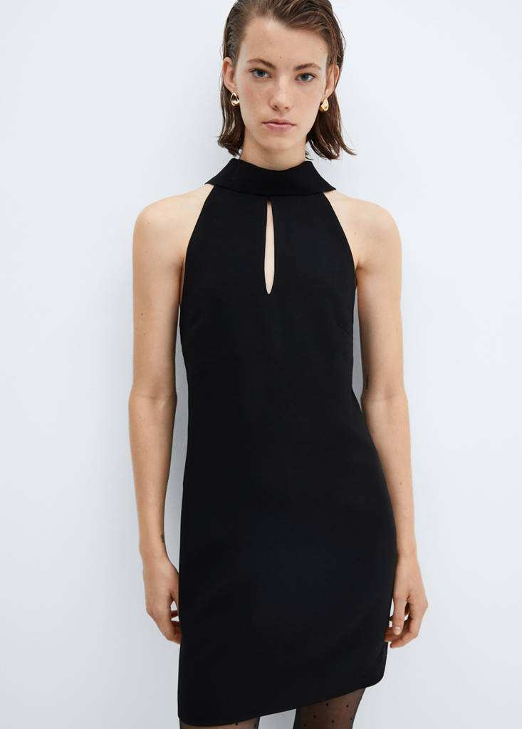 Fluid fabric. Straight design. Short design. Halter neck. Sleeveless. Keyhole detail on the back with button fastening. Front opening. Back zip fastening. Decorative straps. Party, ceremony and communion collection. Office looks