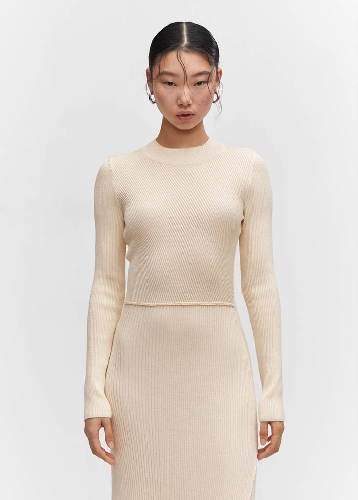 Fine knit fabric, evasé design, fitted design, long design, high collar, long sleeve, unclosed, decorative seams.