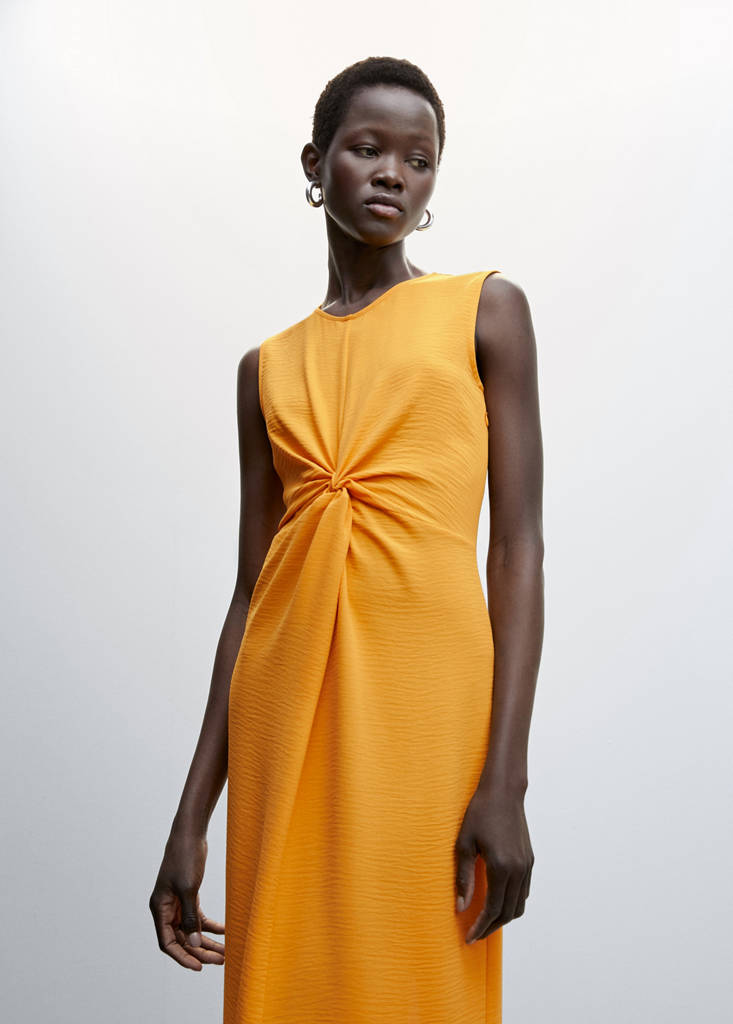 Knot textured dressCurrent price [JPY 6,990 ]JPY 6,990Select a colourOrangeSelect your sizeXSSMLXLDimensionsAdd to WishlistSee lookFree delivery to storeFlowy fabric. Textured fabric. Midi design. Fitted design. Rounded neck. Sleeveless. Invisible lateral zip fastening. Knot detail. Back-slit hemDetails, composition and careStore availability