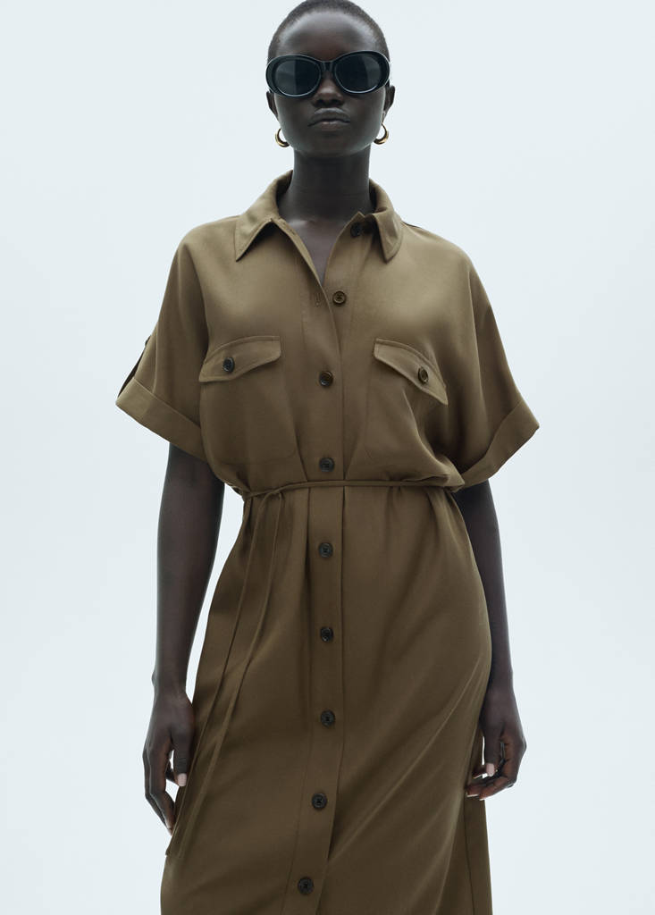 Lyocell shirt dress with bowCurrent price [JPY 9,900 ]JPY 9,900Select a colourKhakiThe model is wearing size S and is 171cm tall.Select your sizeXSSMLXLDimensionsAdd to WishlistSee lookFree delivery to storeStraight design. Midi design. Shirt collar. Short sleeve with Buttoned fastening. Two front flap pockets. Button fastening at the front. Linen and lyocell blend fabric. Shirt-styleDetails, composition and careStore availability