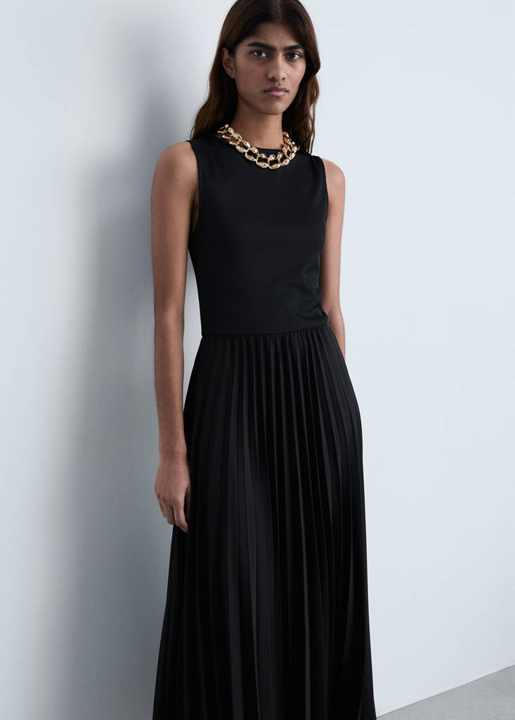 Pleated long dressCurrent price [JPY 11,900 ]JPY 11,900Select a colourBlackThe model is wearing size S and is 171cm tall.Select your sizeXSSMLXLDimensionsAdd to WishlistSee lookFree delivery to storeFluid fabric. A-line design. Pleated design. Combined design. Midi design. Round neck. Sleeveless. No Fastening. Inner lining. Ramadan CollectionDetails, composition and careStore availability