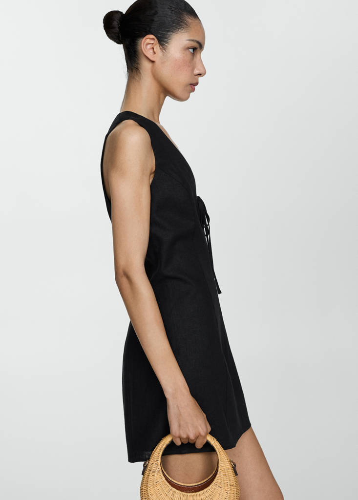 Linen mix. Short design. Straight design. V-neckline. Sleeveless. Wide straps. Invisible back zip fastening. Decorative bow. Inner lining. Available Plus