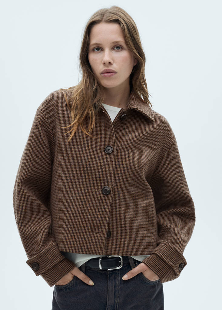 Wool mix fabric. Straight design. Short design. Micro houndstooth print. Shirt collar. Button fastening at the front. Inner lining. Long buttoned sleeves